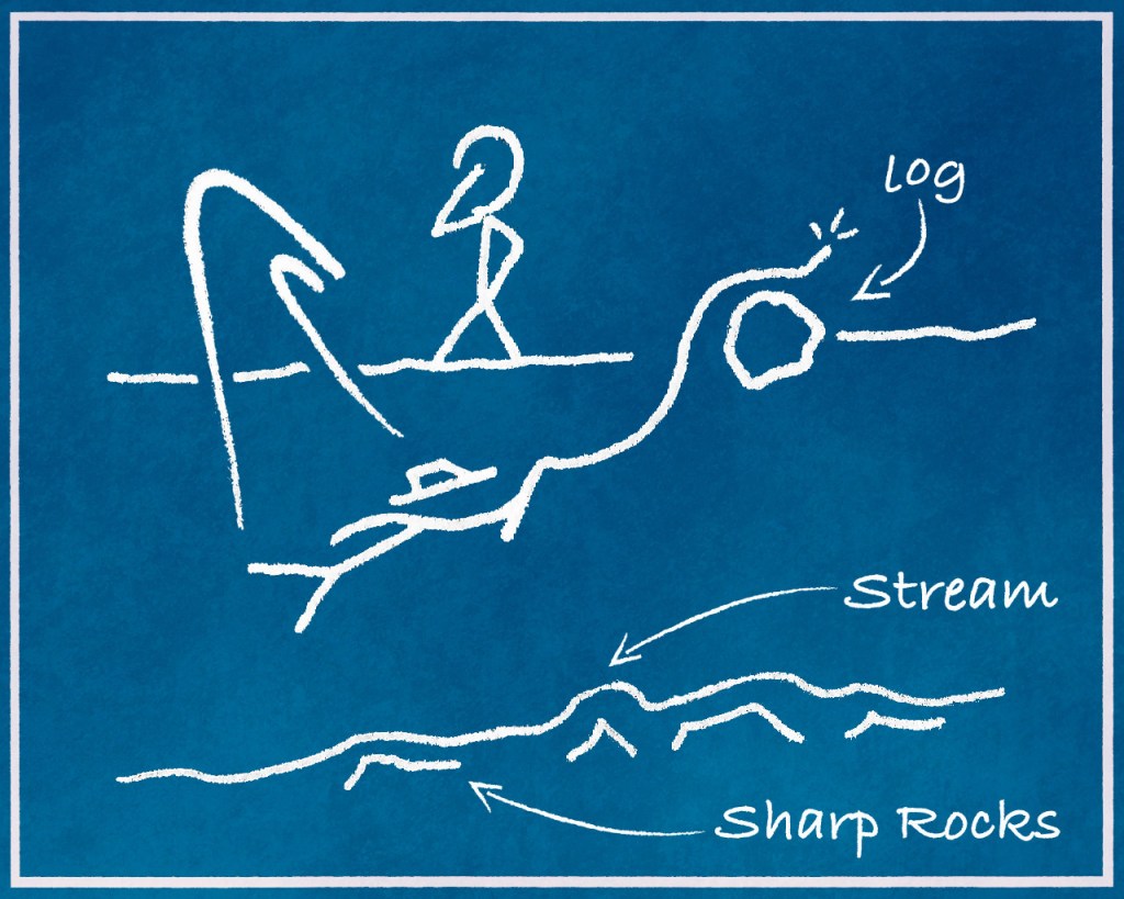 I had figured that if I just jumped straight out (not up), over the stream, gravity would allow me to swing down into the water and I would just have to be careful of my footing when I landed. And it would have worked if I had remembered just one thing. In all the excitement, at the last second, right as I jumped I allowed slack to occur in the whip. So as I jumped out, parallel to the ground, my whip came loose and I dropped like a stone into the rushing stream, and onto the sharp rocks hidden underneath. I just laid there for a moment letting the icy waters wash away my anger and embarrassment. But when I finally lifted my head all I could hear was laughter. Erich’s laughter. At me. I deserved it. After all, I laughed at him when he was catapulted out of the tree.