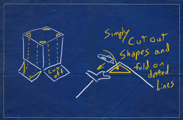 Marks were made and assignments given. I had planned on altering a simple four-sided box into an octagon. Just remove triangular sections from the corners of the top. Cut along the corner edges of the box and then fold along the dotted lines. Instant octagon! Erich was more than willing to assist in this endeavor. That was really nice of him. A good friend. So we gathered up a couple of box cutters, fresh razor blades, and began.