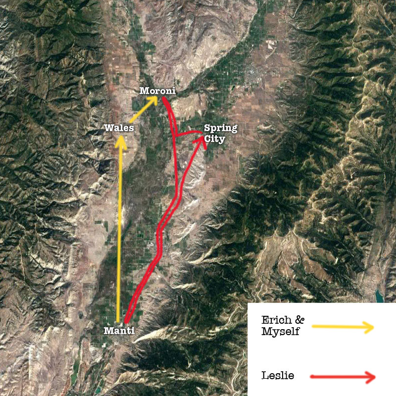 We once again knocked on Cindy’s parents’ door and asked to use their phone. Erich called Dawn, she wasn’t there but her mother, Leslie, was. Erich asked if she could come and get us instead and eventually, she agreed to give us a ride. It only meant that she would have to drive North from Spring City to Moroni, then South to Manti, then North once more to get home in Spring City. No big deal. It wasn’t like she had been asleep because she had to be up early the next morning or anything. All was well.