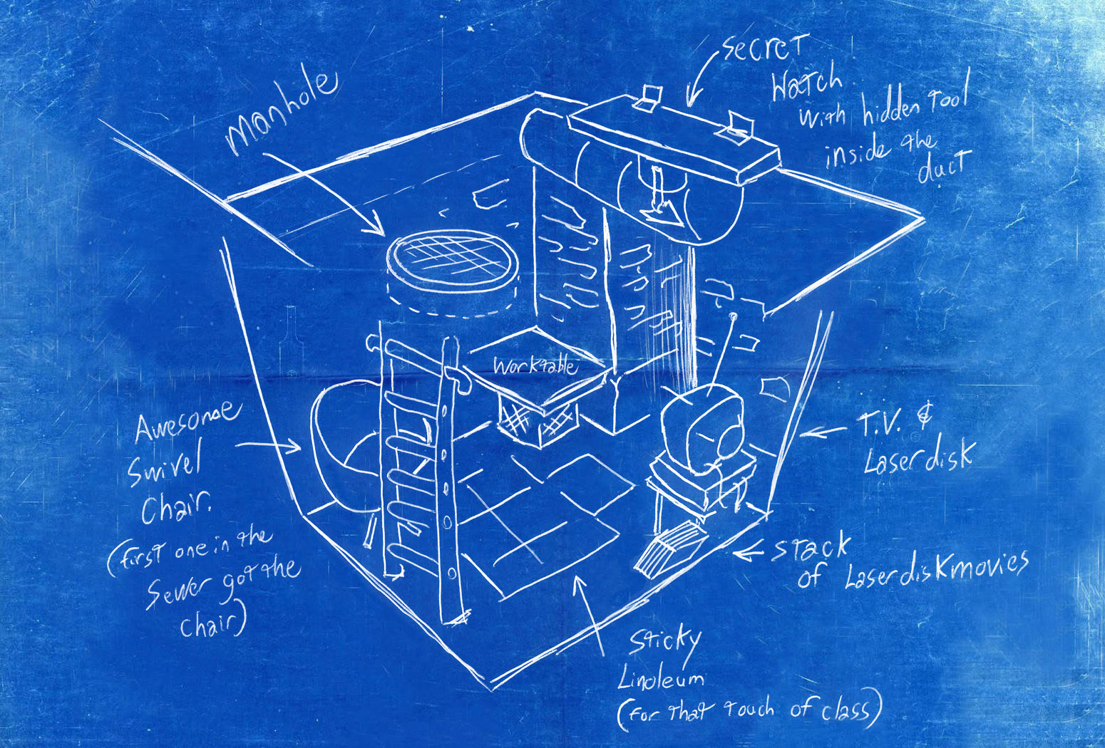 With enough looking a person can find anything. And we did too. I found an old hoe with a broken handle and a pointed tip that fit into the notch on the edge of the cover. We cut the handle down and found a spot to stash the tool so it wouldn’t get misplaced. Ironically, we had to create a secret panel wherein the tool could be secreted into one of the fake ducts placed in The Sewer. I still have that tool and use it in my garden to battle weeds.