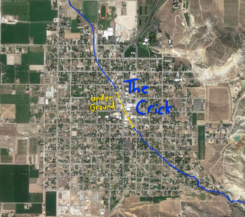Epilogue: Over the years, less and less run-off has been sent through The Crick as better plumbing and irrigation sources have developed. Most of the ditches that regularly ran water (even when I was a teen) have slowly filled with dirt and grass, and are all but gone. Over the years, as I have passed through this lovely little town, my heart aches just a little when I see The Crick void of water, but never of memories.