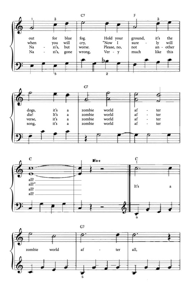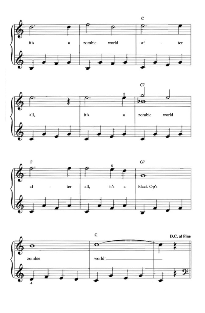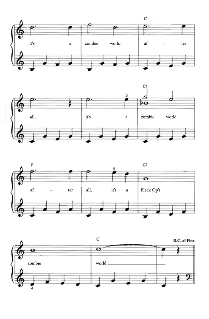 Because I am fond of funโ€”almost too muchโ€”and don’t always know when to stop, there are eleven verses. That’s right, ELEVEN! To allow them all to fit, I have provided four verses to a pageโ€”including the chorus. So, verses 1โ€“4 are pages 1โ€“3, verses 5โ€“8 are pages 4โ€“6, verses 9โ€“11 are pages 7โ€“9, and as a special added bonus (because you ordered right now) I am including the original final verse for free! That’s right free! Sing along with your friends about the insanity of playing Call of Duty zombies, and choose which final verse you like best. Get into a fight with your buddies over which one is better and post it on social media (well, maybe not a fight, but feel free to take sides and argue).