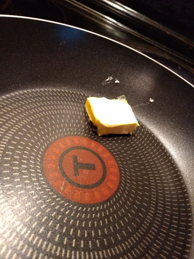 Next, place the butter in the pan and put the pan on the burner. I use this to gauge the pan’s warmth for cooking. How much butter? Well, about two pats worth.