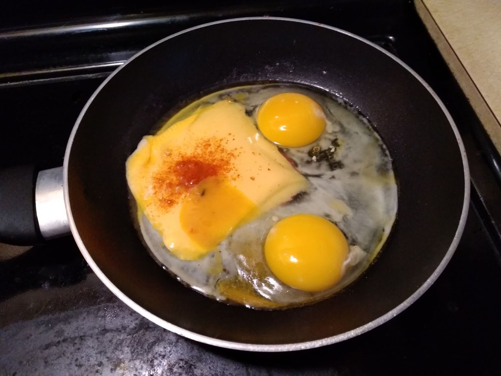 Now add the other stuff! Take the other slice of American cheese and place in pan. Add cayenne pepper to slightly stronger than preferred taste. (I’m not a spicy/pepper fan of any kind, but ooo-yum here) About four good dashes usually does it. Then, a good-sized dollop of the mustard.