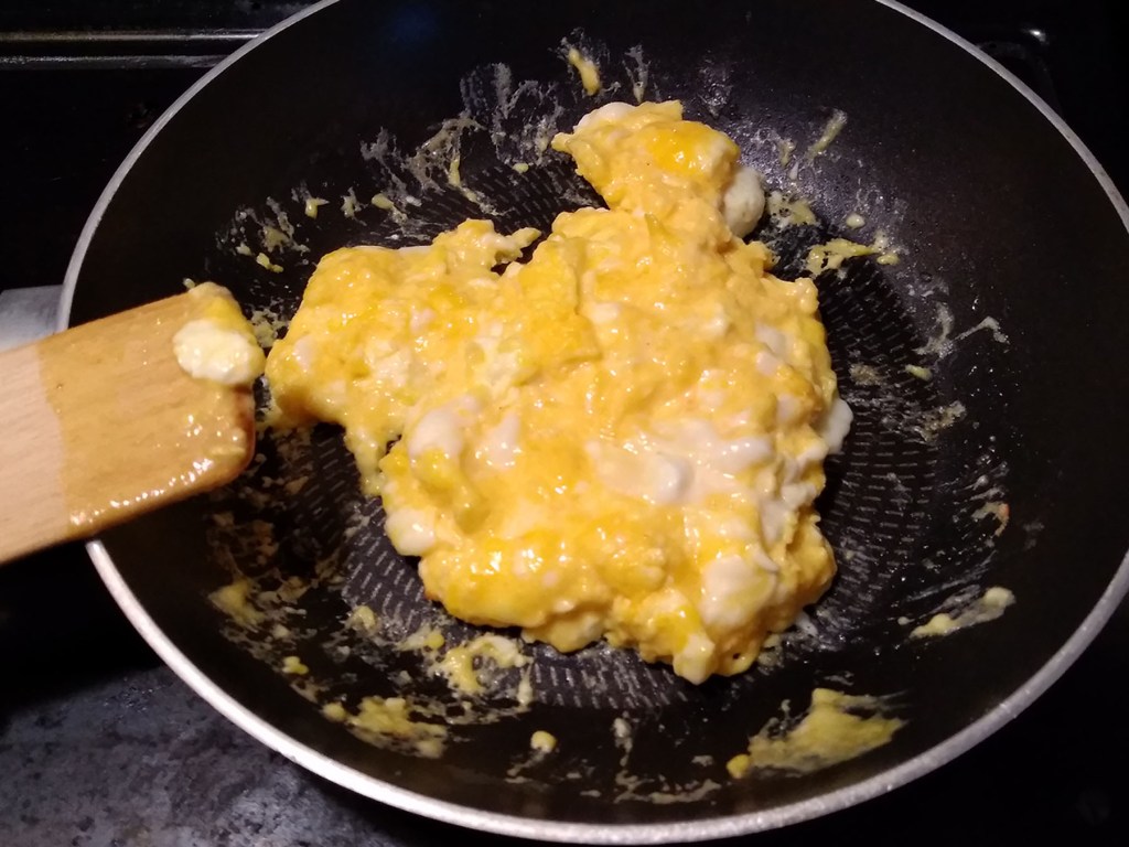 Now just scramble the eggs and cook to desired consistency. I prefer ‘wetter’ eggs. My wife likes ‘drier’ eggs. This part is up to you, it really does not affect the outcome as the flavors are already together.