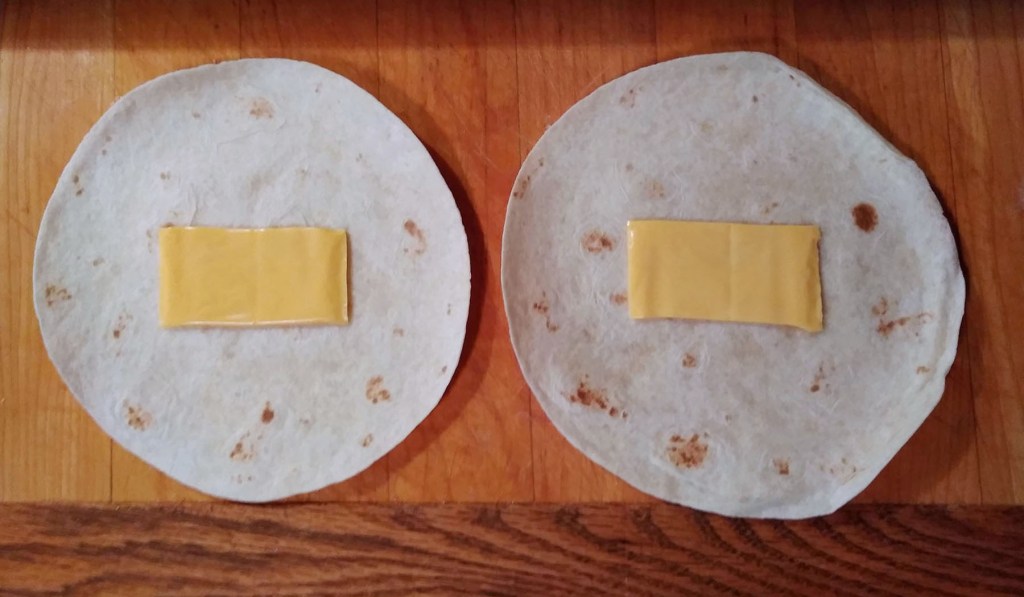 While the butter’s melting, do the preparation work. Set out two tortillas. Take one of the slices of American cheese, tear it in half (if you have to cut the cheese, you got issues). Place one half in the center of each tortilla.