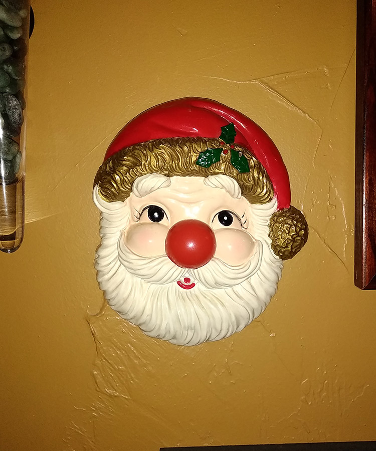Somewhere, in years long past, my mother brought home a wall decoration that made her quickly reget her purchase. It was a Santa Claus face with a push-button nose. When you press his big red nose, it lights up, and the tune of Jingle Bells plays in a slightly digital tone. Once it was up on the wall and the novelty of the tune (and flashing nose) wore off for my siblings, it didn’t for me. Every day, when I got home from school, play, or just being outside, and walked past that nose (or even just walked past that Santa) I would press that nose. You would think that with all those years of nose pushing that the thing would break. Nope. It’s still going strong.