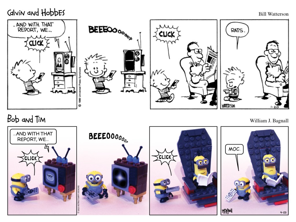 I started this project years ago. I’ve spent a lot of time collecting bits and bobs to combine Bill Watterson’s Calvin & Hobbes universe with a touch of the minion world. It was meant to be just a personal project, but I have decided to share it. Mostly because it will force me to finally complete more of them. And so, here is another Bob & Tim.