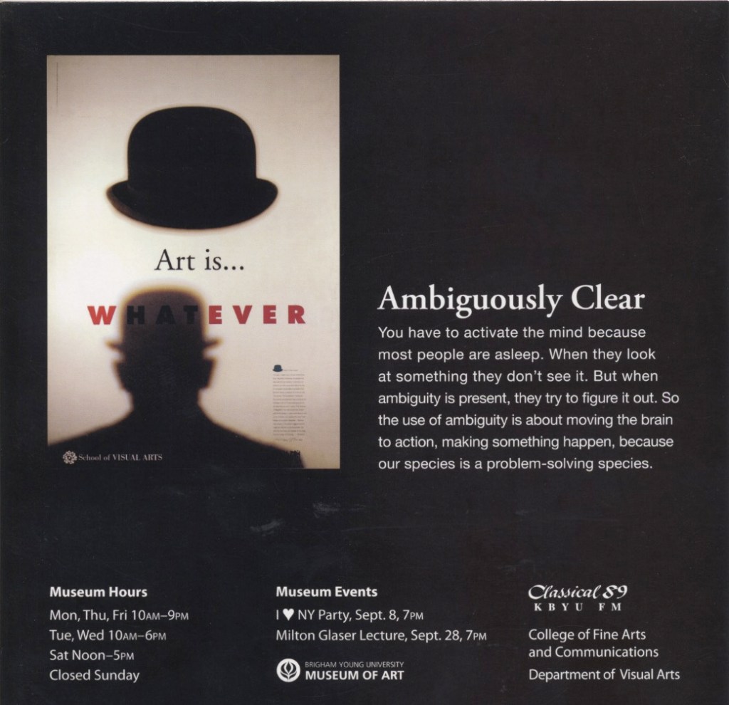 It was the senior year of my undergrad studies. Our group of graphic design students had become quite close. There were very few of us. After the first two years of general studies in almost the same classes and the last two years in the same classes (more specifically, the exact same classroom—small campus program, at the time), what else would you expect? It was a great group. Still, senior year brought a grand senior trip to a grand exhibit at Brigham Young University: An exhibit of the work of Milton Glaser.