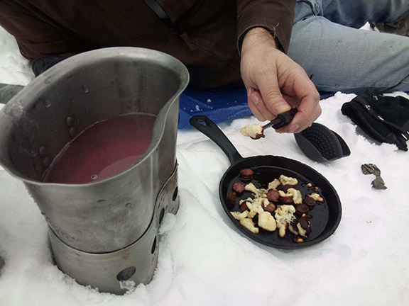 In preparation for this meal, I had not properly thought out what to bring for food. So, for this trip, we had something simple. A meat stick snack and a couple of string cheese sticks. Aurora chopped up the beef and I set up the portable oven. This trip I wanted to try something new: A miniature cast-iron skillet. It was the perfect size for the portable stove. I used one military fuel bar. It was just the right size to fit the stove and burn just long enough to heat up the pan and cook the food.