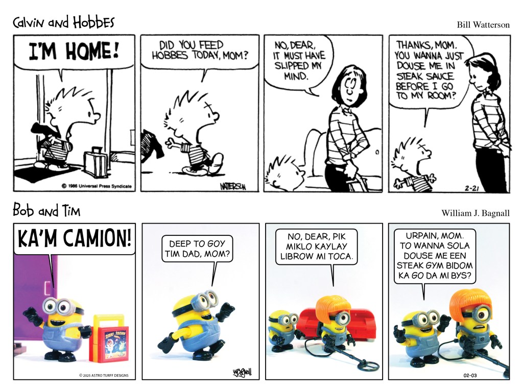 I started this project years ago. I’ve spent a lot of time collecting bits and bobs to combine Bill Watterson’s Calvin & Hobbes universe with a touch of the minion world. It was meant to be just a personal project, but I have decided to share it. Mostly because it will force me to finally complete more of them. And so, here is another Bob & Tim.