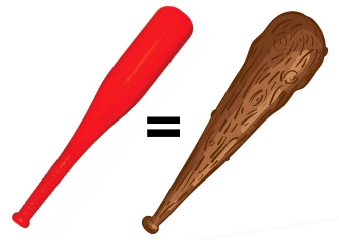 Brian S. (the one a year younger than me) had a red plastic baseball bat that I guess was designed to make it easier for children to hit a ball with because it was bigger on one end. Like a club. Like Captain Caveman’s club.
